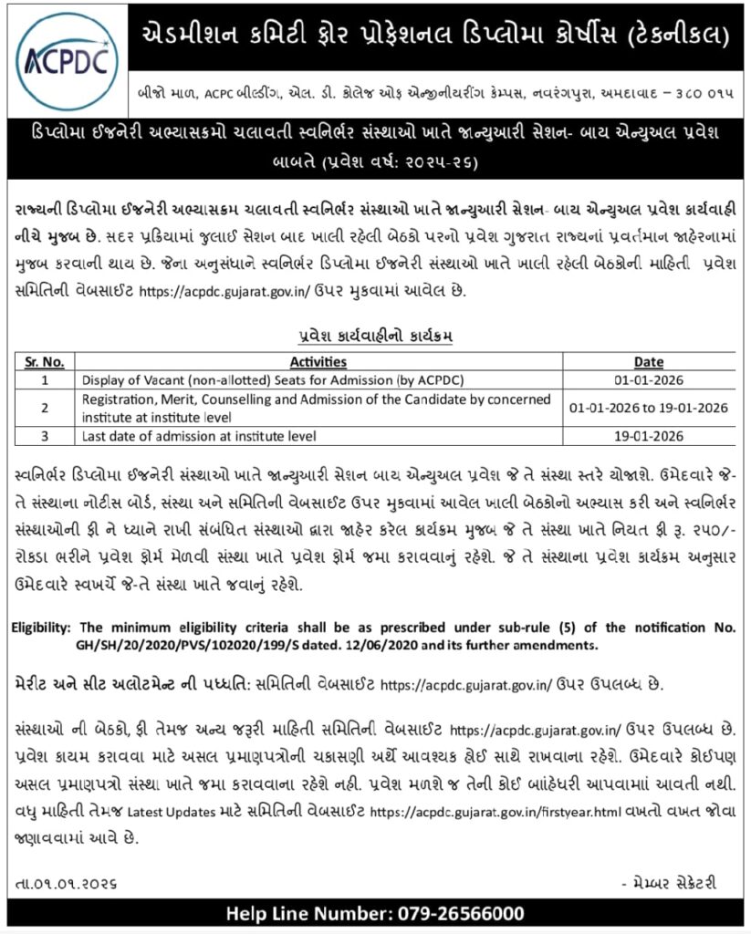 Admission to January intake Year : 2025-26 Contact to admin office personally or Telephonic for Admission in First Year Diploma