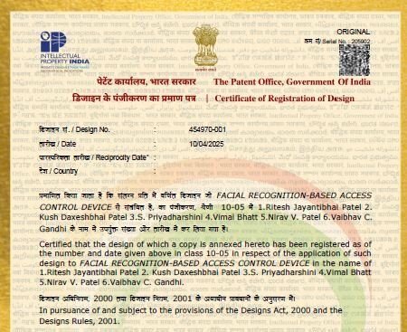Mr.R.J.Patel ,Computer Engineering Department , has got the Patent approval from The Patent office, Government of India on “FACIAL RECOGNITION-BASED ACCESS CONTROL DEVICE” on dated 31/07/2025 with design no : 454970-001 approval till 30/07/2035