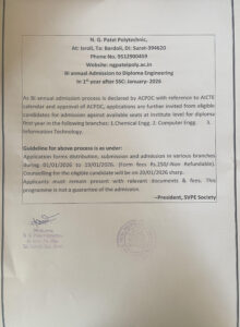 Established in 1997 as a Center for Excellence, N. G. Patel Polytechnic [NGPP] is recognized by All India Council for Technical Education (AICTE), New Delhi and Gujarat Technological University (GTU), Ahmadabad.The institute is situated near Isroli-Afwa in Bardoli taluka of Surat District, about 4 KMs away from Bardoli Town. The institute provides students all possible infrastructure and educational facilities such as neat and airy classrooms, tutorial rooms, fully equipped laboratories, to empower them in communicative English, computer center, library, workshop, playground and canteen. The institute has emerged as forerunner in the field of imparting quality education by touching peak heights of result by falling under state level university ranking in top 10, professional training and development and good placements in multinational companies.